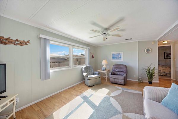 Welcome to Tidevue Estates – A Premier 55+ Land-Owned Community. 4511 14th Street East is charming, turnkey furnished home is the perfect choice for year-round living or a sunny winter retreat. Nestled in the heart of Tidevue Estates, this land-owned property (no lot rent!) offers comfort, convenience, and a vibrant lifestyle. Step inside to discover 2 bedrooms, 2 bathrooms, laminate flooring throughout with plush carpet in the bedrooms, creating a cozy yet low-maintenance space. Abundant windows and two skylights fill the home with natural light, enhancing the bright, open feel. To your left, the kitchen features cheerful light green wood cabinetry, ample counter space, and a convenient breakfast bar. Across the way, a dining area with a built-in china cabinet and eating area is ideal for hosting guests and holiday gatherings. Come see what Florida retirement living is all about! The spacious living room is tastefully decorated in soft neutrals, with plenty of room to relax and enjoy your favorite shows on the big-screen TV. Enjoy peaceful mornings in the newly remodeled sunroom, complete with pull-down shades on every window for added privacy—perfect for sipping coffee and watching the world go by. The owner’s suite features a large walk-in closet and an en-suite bathroom, while the spacious guest bedroom is ideal for visitors or a home office. The oversized garage offers a washer and dryer, plus plenty of storage space and room for a workshop or hobby area. Low annual HOA fee of just $600 per year. Tidevue Estates offers resort-style amenities, including:? Solar-heated pool, Updated fitness center, Shuffleboard courts, Expansive library with a wide selection of books, Scenic bike trails and lakefront benches—perfect for evening sunsets. Located just off Hwy 301, you’re minutes from top restaurants, shopping, I-75, and the Ellenton Premium Outlet Mall. A short drive takes you to the Gulf beaches, University Town Center Mall, and cultural attractions like the Mote Aquarium, Ringling Museum, and St. Armands Circle. Tidevue is a pet-free community. Tidevue Estates offers the perfect combination of location, lifestyle, and community charm.