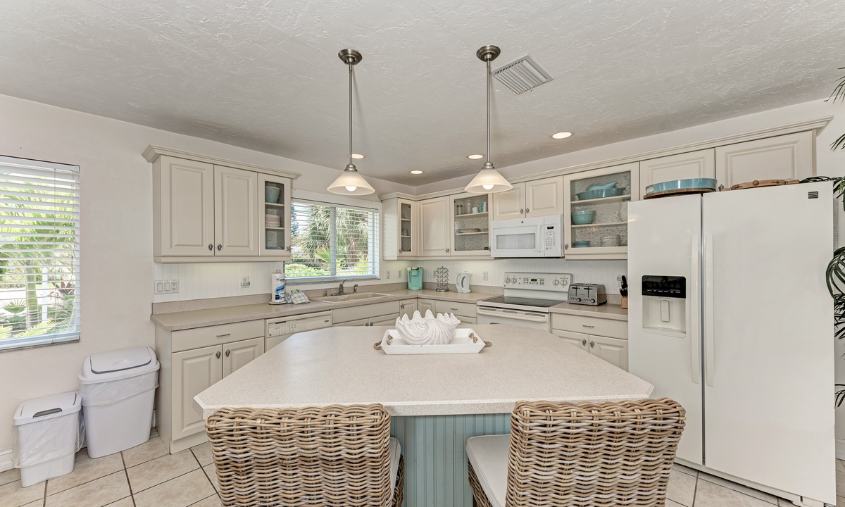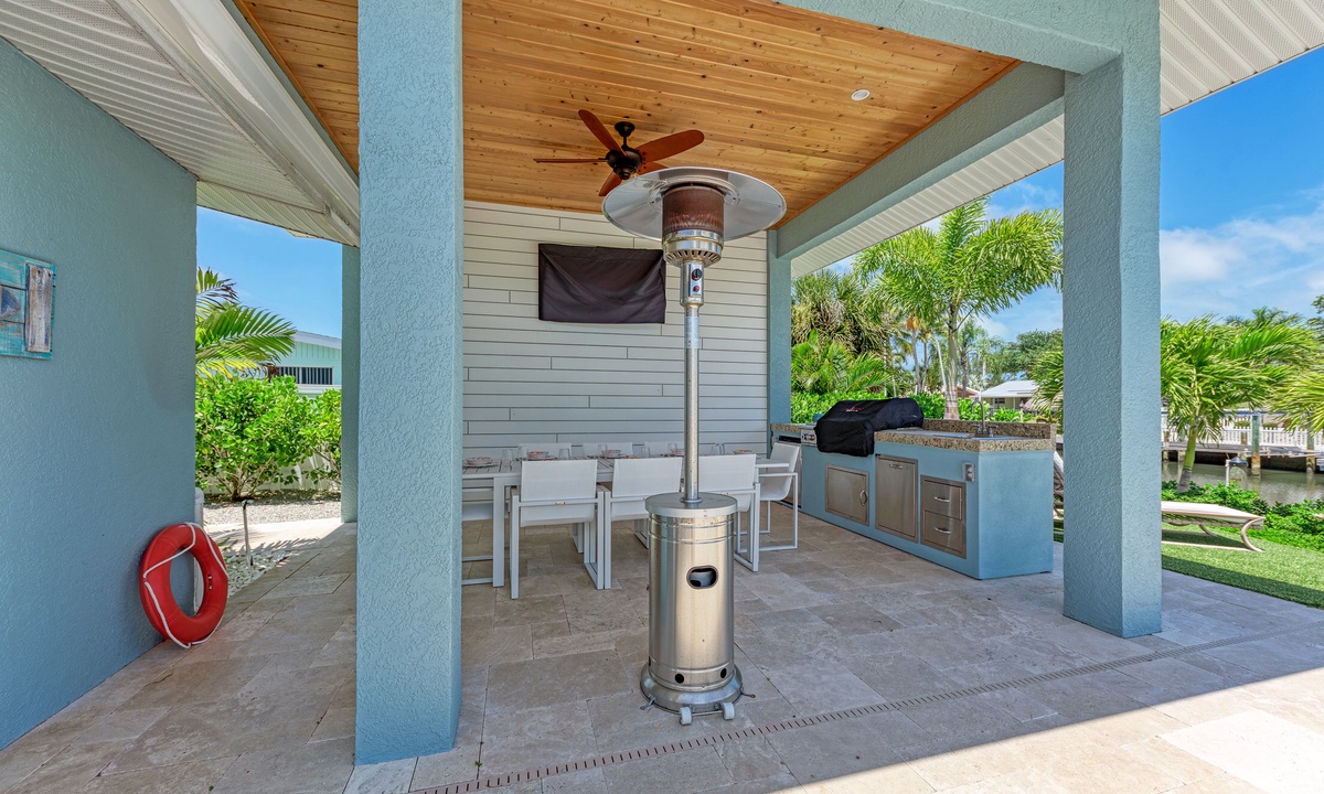 All brand new designer furniture in living room and 2 master suites. One master walks out to the pool area to look out over the water with views of the bay and beyond. Outside is a covered dinning space with seating and a custom outdoor kitchen and grill to entertain or relax your cares away.